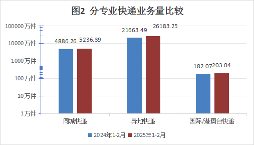1-2月,同城快递业务量累计完成0.52亿件,同比增长7.17%;异地快递业务量累计完成2.62亿件,同比增长20.86%;国际/港澳台快递业务量累计完成203.04万件,同比增长11.51%。