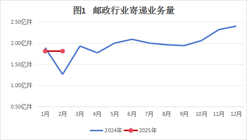 2月份,邮政行业寄递业务量完成1.81亿件,同比增长44.39%。其中,快递业务量完成1.59亿件,同比增长52.59%。