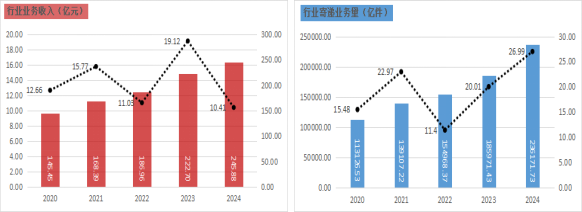 2024年邮政行业业务收入(不包括邮政储蓄银行直接营业收入)完成245.88亿元,同比增长10.41%。其中:快递业务收入完成164.46亿元(备注1),同比增长17.78%(按可比口径计算,下同)。快递业务收入占行业总收入的比重为66.89%,比上年提高了4.19个百分点。