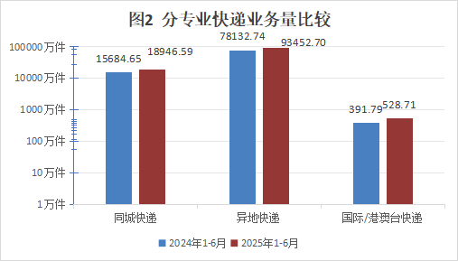 上半年,同城快递业务量累计完成1.89亿件,同比增长20.8%;异地快递业务量累计完成9.35亿件,同比增长19.61%;国际/港澳台快递业务量累计完成528.71万件,同比增长34.95%。