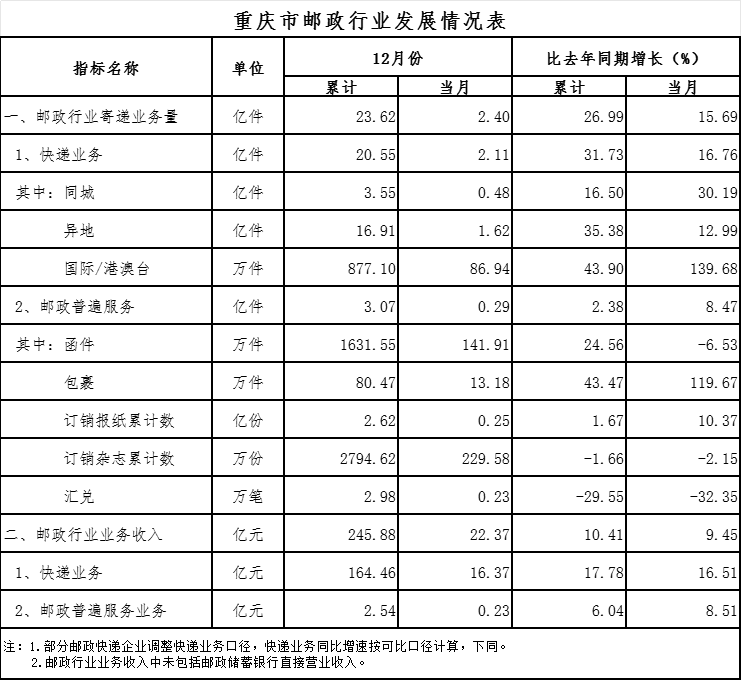 1.部分邮政快递企业调整快递业务口径,快递业务同比增速按可比口径计算。