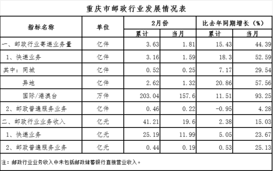 2月份,邮政行业业务收入完成19.6亿元,同比增长15.03%。其中,快递业务收入完成11.99亿元,同比增长23.67%。