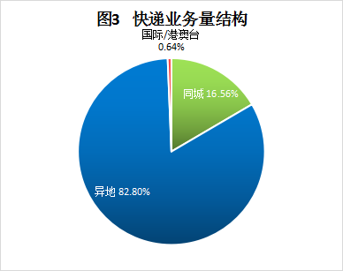 1-2月份,同城、异地、国际/港澳台快递业务量分别占全部快递业务量的16.56%、82.8%和0.64%。与去年同期相比,同城快递业务量的比重下降1.72个百分点,异地快递业务量的比重上升1.76个百分点,国际/港澳台业务量的比重下降0.04个百分点。